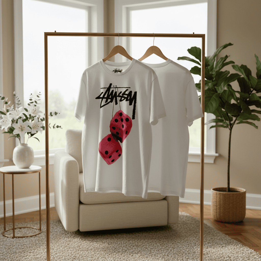 Stussy White Street Cotton T-Shirt with bold red dice graphic and signature logo, unisex design, vintage street style, soft breathable fabric, showcasing timeless urban fashion.
