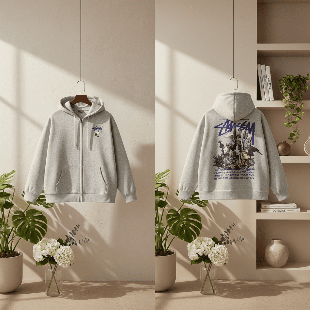 Stussy Grey Zip Hoodie crafted from soft cotton, features subtle front logo and colorful back graphic. Unisex streetwear style offers comfort, versatility, and modern artistic vibe.