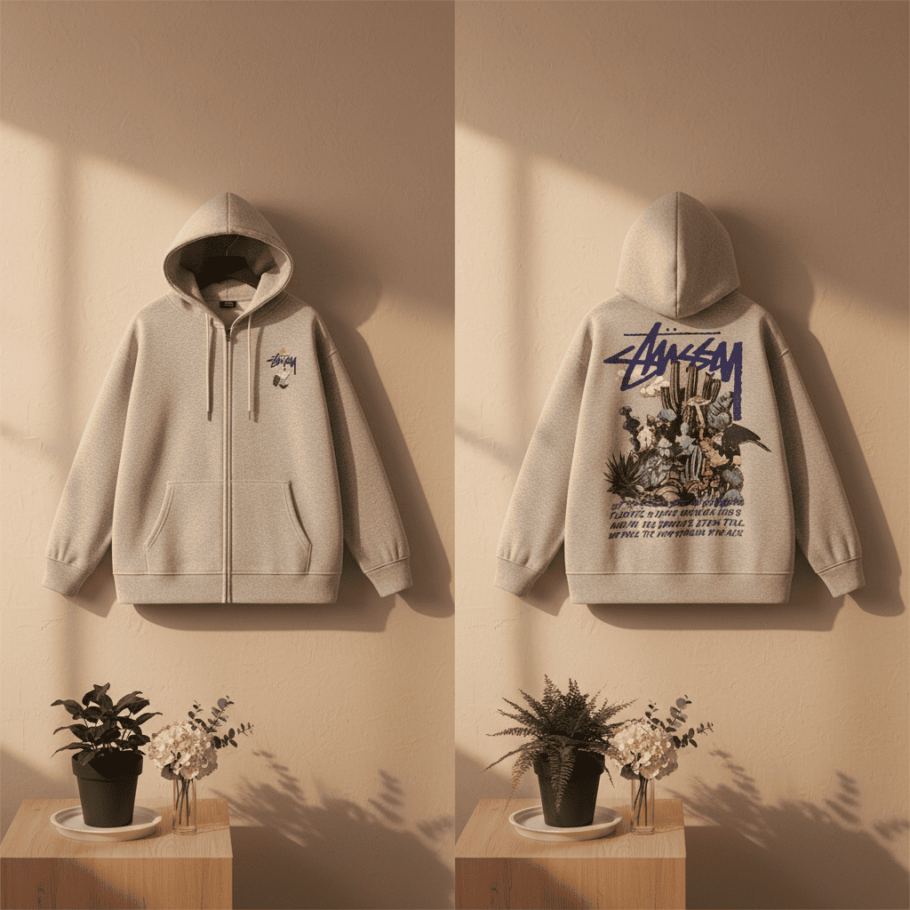 Stussy Grey Printed Zip Hoodie made from soft breathable cotton, features a bold artistic back design, minimalist front logo, kangaroo pockets and drawstring hood, unisex casual streetwear style.