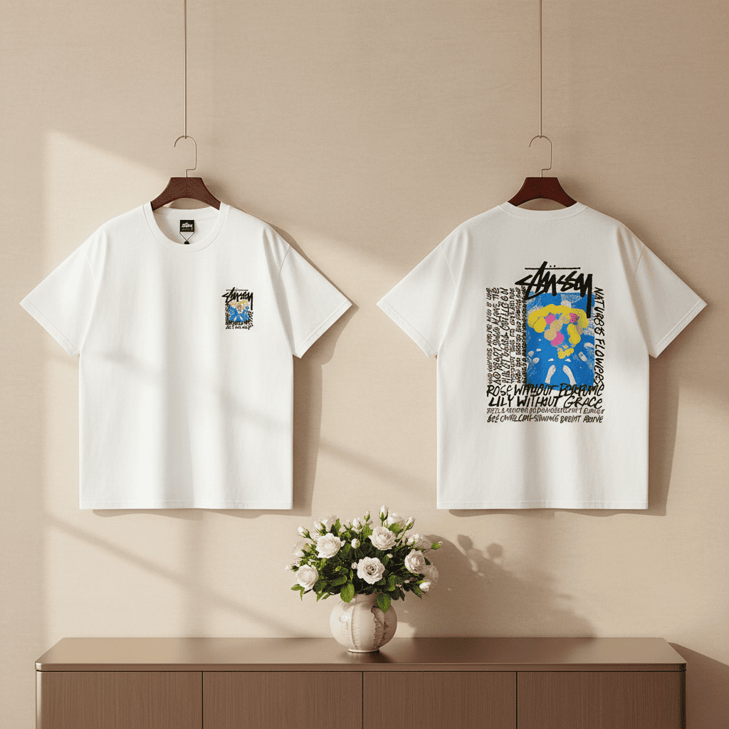 Stussy White Graphic T-Shirt, soft cotton fabric with artistic graffiti floral print on back, streetwear style, unisex design, retro art vibe with a comfortable fit for everyday wear.
