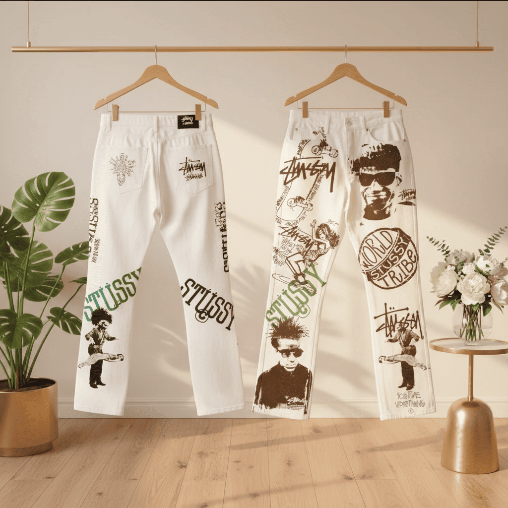 Stussy Graffiti Print Streetwear White Jeans Pants