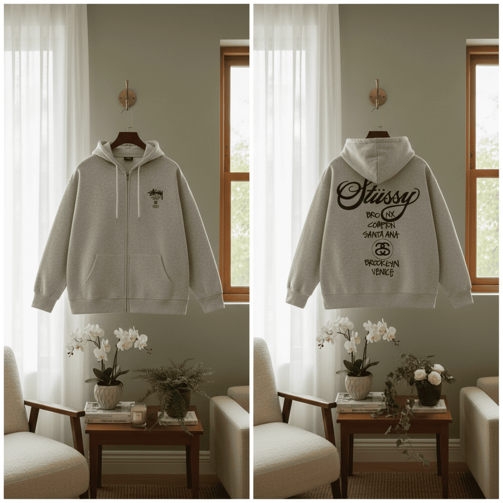 Stussy Grey Zip Hoodie made from premium cotton blend, soft and breathable. Features chest logo embroidery, city hand-style print on back, kangaroo pocket, drawstring hood, unisex streetwear fit.