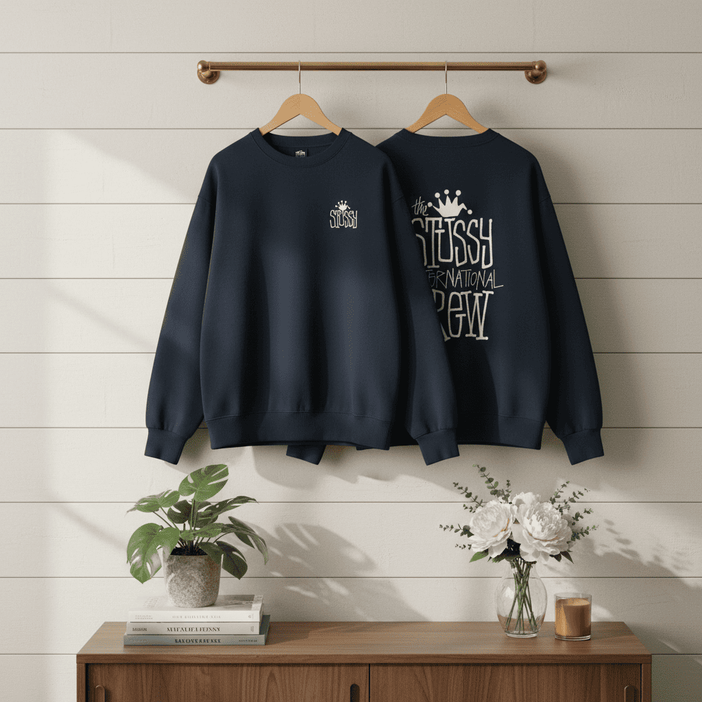 Stussy Deep Blue Crewneck Sweatshirt—made from soft cotton, features classic graffiti logo and crown print, unisex loose fit, breathable comfort, capturing 90s retro streetwear vibe for everyday style.