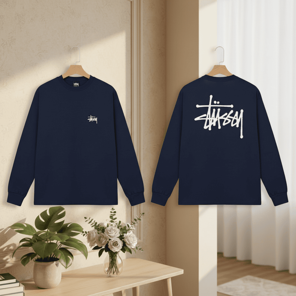 Stussy Navy Long Sleeve T-Shirt made from soft breathable cotton, featuring white graffiti logo on chest and back. Classic crew neck, unisex design, perfect for streetwear and skate culture style.