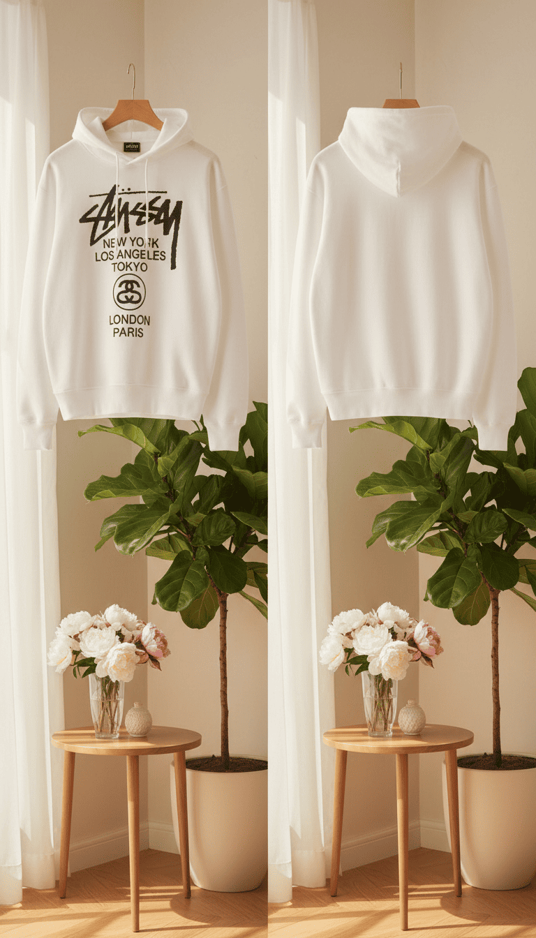 Stussy White City Series Hoodie made from soft cotton, featuring bold black graffiti logo and city print. Relaxed fit with drawstring hood, unisex style, ‘90s retro streetwear vibe, versatile and casual.