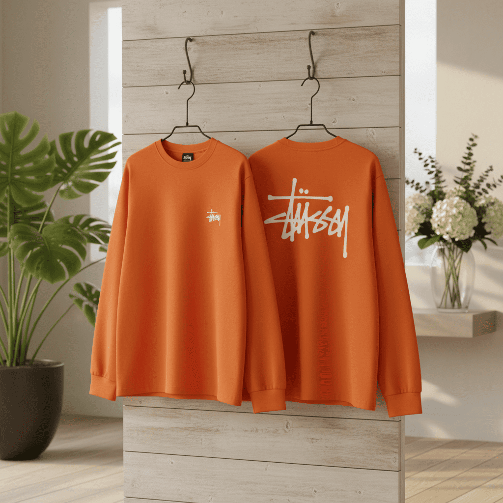 Stussy Orange Long Sleeve T-Shirt made of premium cotton, soft, breathable, and comfy. Features graffiti logo on chest and back, unisex crew neck style with 90s retro skate street vibes.