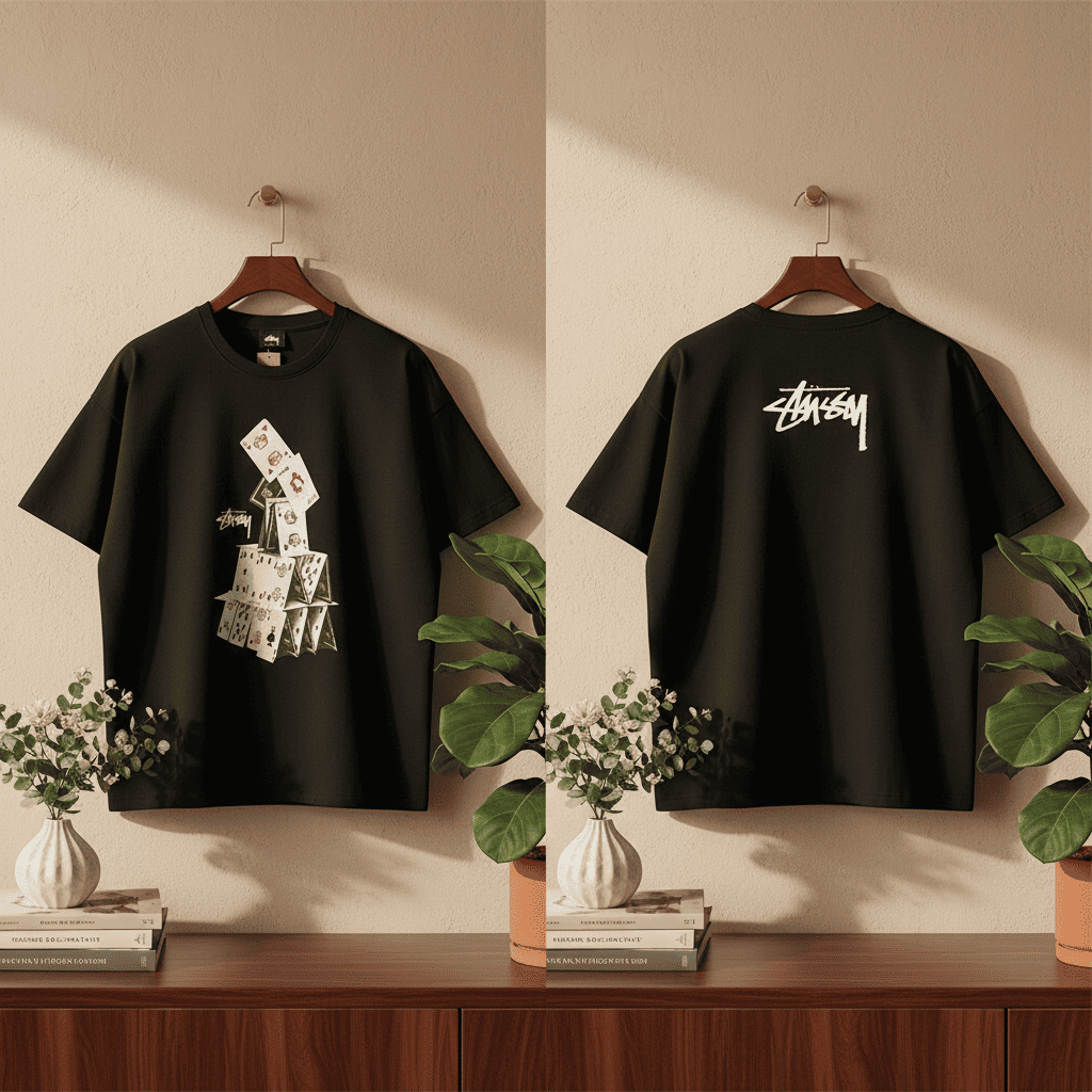 Stussy Black House of Cards Graphic T-Shirt made from premium soft cotton. Features unique playing card tower print with iconic hand-style logo. Loose fit unisex design for retro 90s skate style.