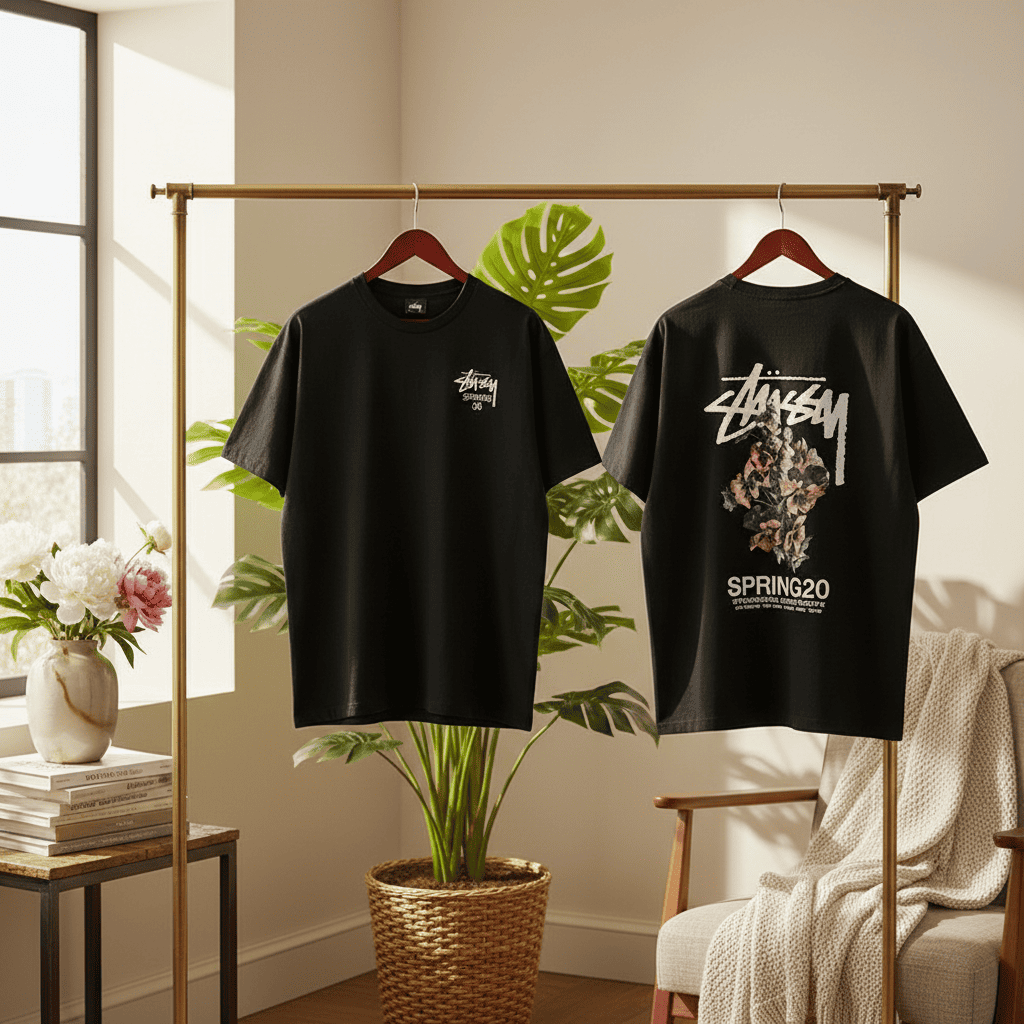 Stussy Black SPRING20 T-Shirt made of premium cotton, breathable and soft. Front logo print and floral graphic back design with signature script. Loose fit, unisex style for streetwear and casual outfits.