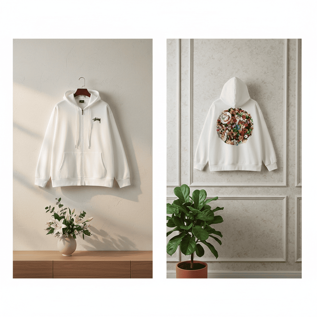 Stussy White Cotton Zip Hoodie with black logo embroidery and colorful floral back print, unisex loose fit, breathable and comfy for daily streetwear and casual fashion style.