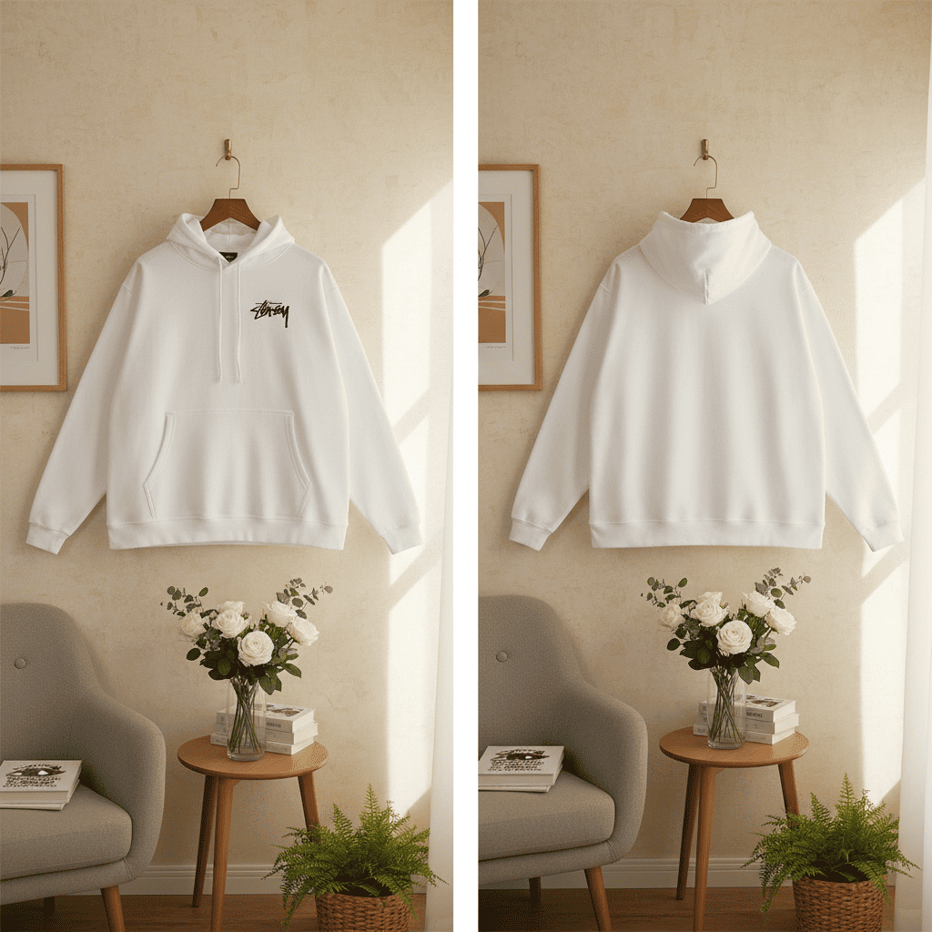 Stussy White Street Style Hoodie crafted from soft pure cotton, features signature handwritten logo on chest and blue eye graphic on back. Unisex loose fit for casual or urban wear.
