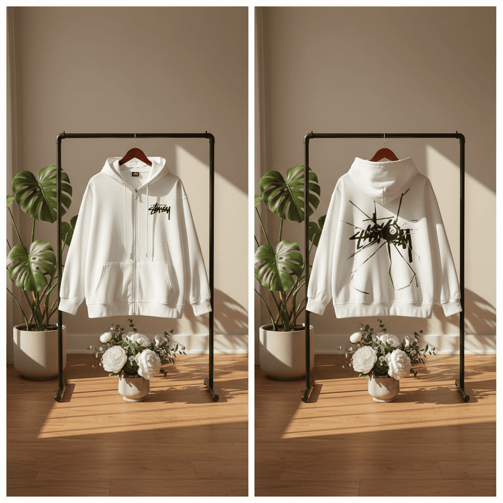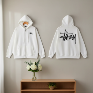 Stussy White Zip Hoodie made from soft cotton, featuring classic logo print on chest and cracked eye graphic on back. Loose fit unisex design perfect for street, skate, and casual wear.