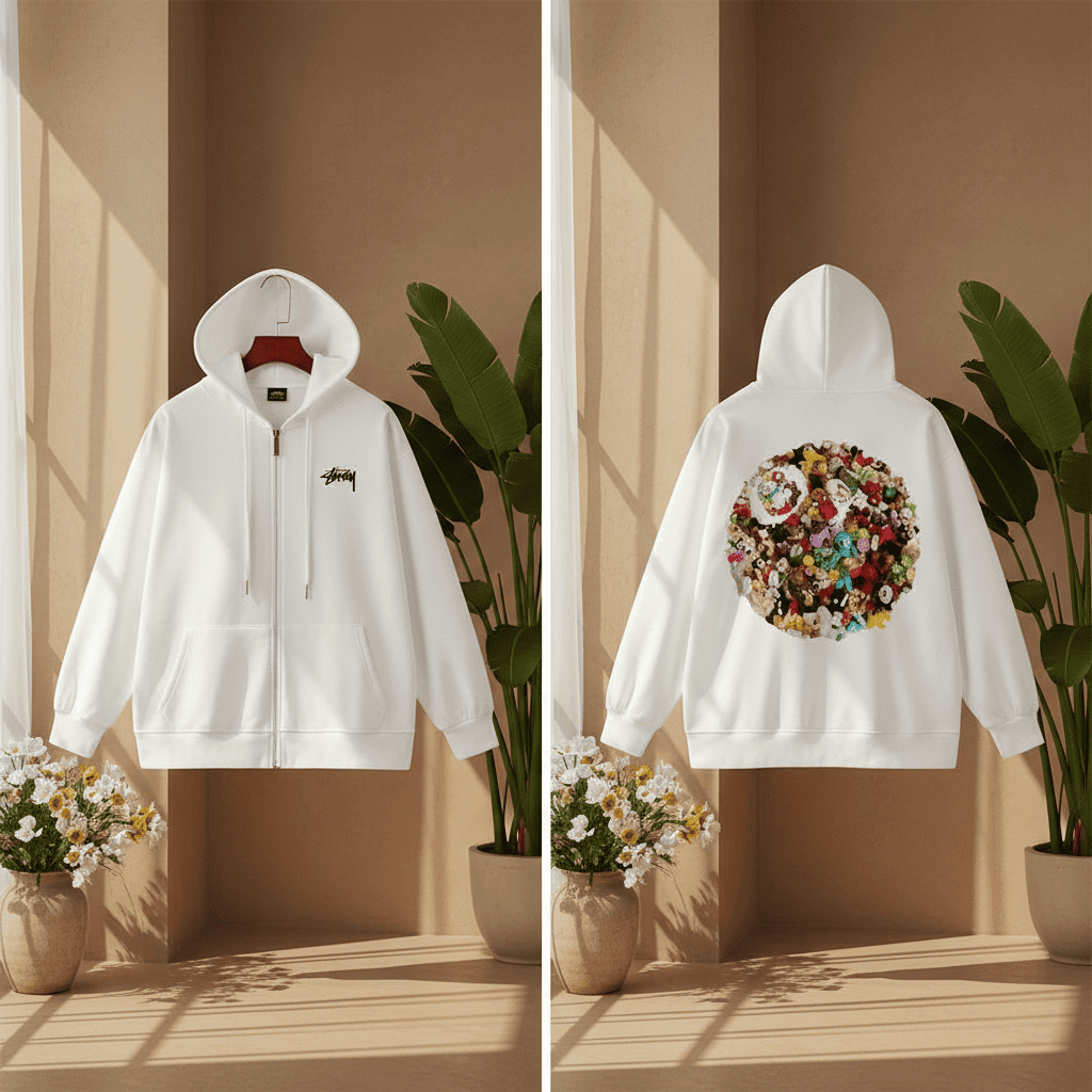 Stussy White Zip Hoodie made of soft cotton, features classic logo embroidery on chest and colorful art graphic on back, unisex streetwear style combining comfort and urban attitude.
