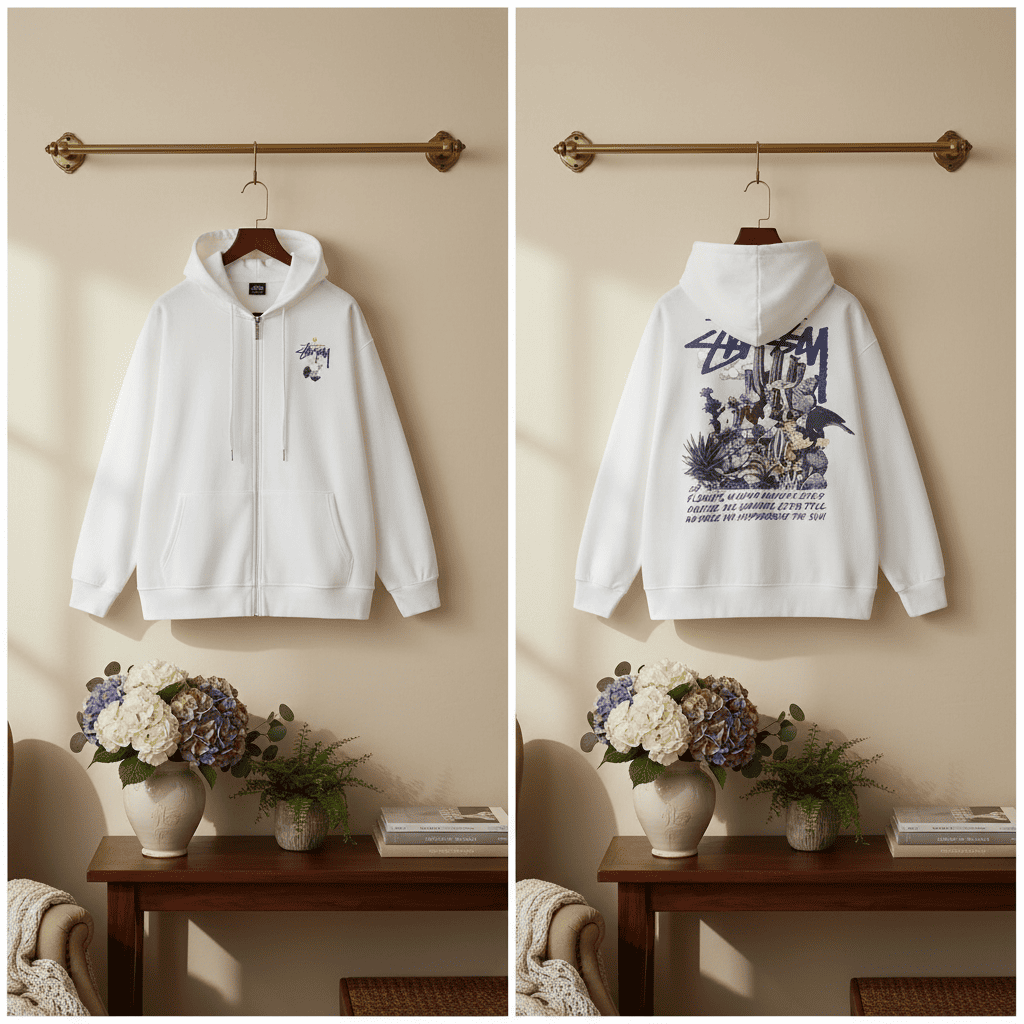 Stussy White Zip Hoodie made of premium cotton features front logo print and urban nature art on back, loose fit, drawstring hood, kangaroo pocket, unisex streetwear with 90s retro vibe.