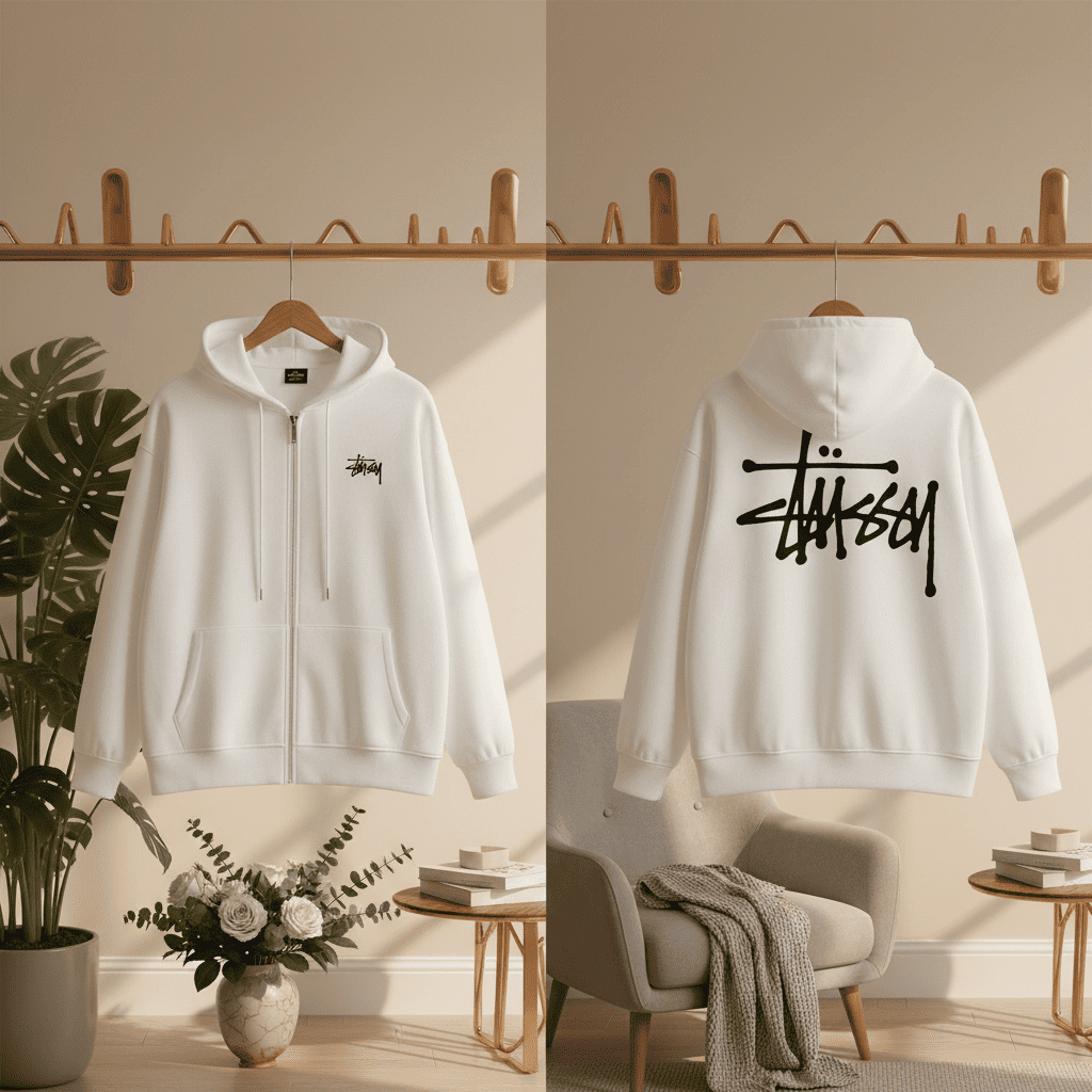 Stussy Skull Print White Zip Up Hoodie