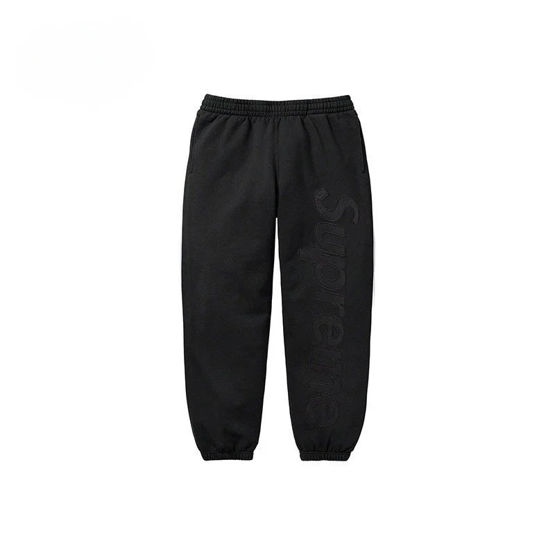 Supreme black logo embroidered jogger pants made from high-density cotton. Soft, breathable, with elastic drawstring waist and tapered cuffs. Streetwear unisex design for daily urban style.