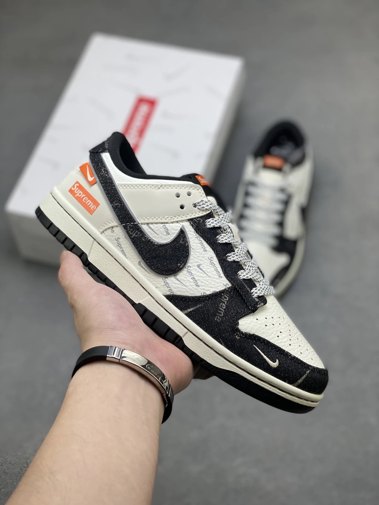 Supreme Black White Low-Top Sneakers combine premium canvas and leather, featuring an orange logo accent, bold street style design, durable rubber sole, thick laces, and unisex comfort and fashion.