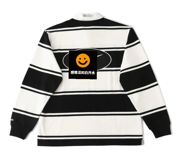 Supreme black and white striped long sleeve T-shirt made from soft pure cotton. Features a smiley and graphic on the back, classic crew neck, relaxed fit, unisex streetwear for casual and trendy style.