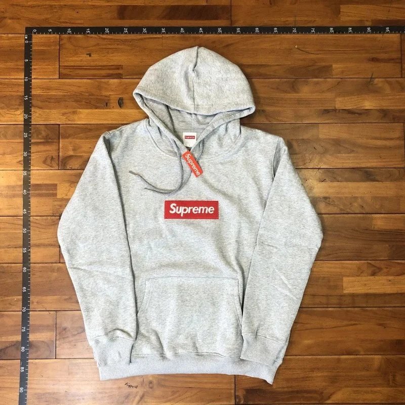 Supreme Grey Hoodie – Soft cotton fabric with iconic red Box Logo, unisex loose fit, streetwear style, simple yet stylish, perfect for everyday urban fashion and casual comfort.