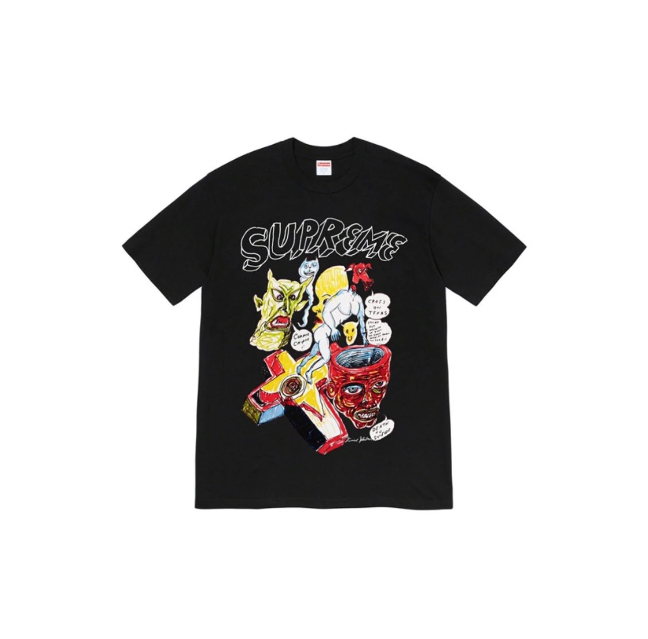 Supreme Black Street Art Graphic T-Shirt, made of premium soft breathable cotton, features comic-style totem design, trendy casual unisex style for everyday fashion wear.