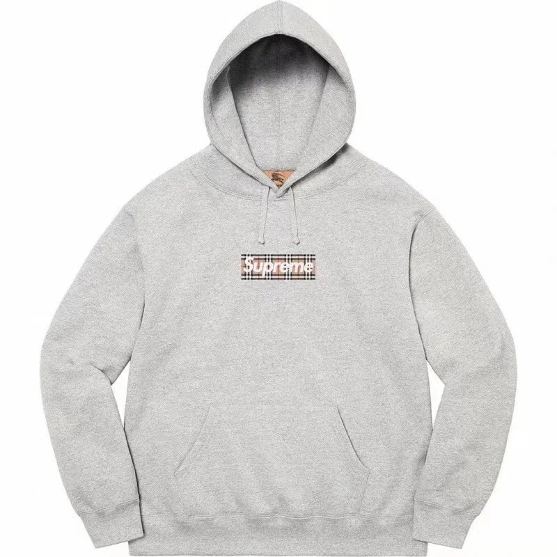 Supreme Grey Plaid Logo Hoodie features heavyweight cotton for warmth and comfort, classic Box Logo with British plaid design, drawstring hood, kangaroo pocket, and unisex urban street style.