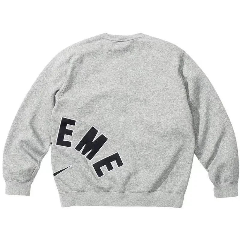 Supreme Grey Casual Sweatshirt, crafted from soft cotton for comfort, features bold curved black lettering on the back, unisex streetwear style perfect for daily outfits with modern urban attitude.