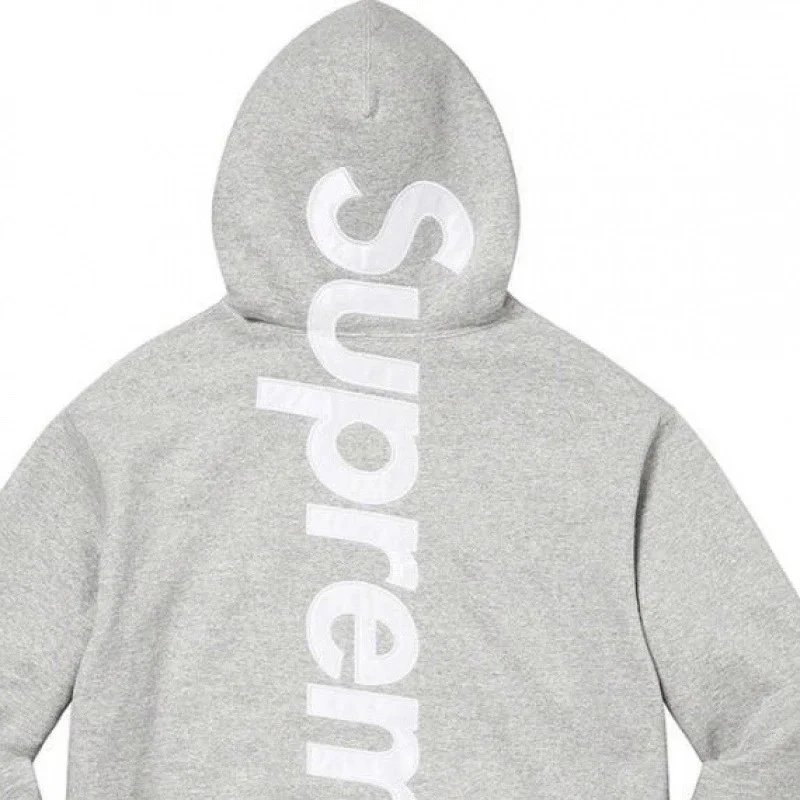 Supreme Gray Hoodie made from soft cotton, features a vertical white logo print on the back, unisex design with minimalist street style for casual comfort and modern fashion appeal.