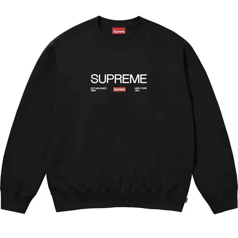 Supreme Black Classic Logo Crewneck Sweatshirt, soft cotton fabric with minimalist print, unisex casual style, inspired by 90s New York street fashion.