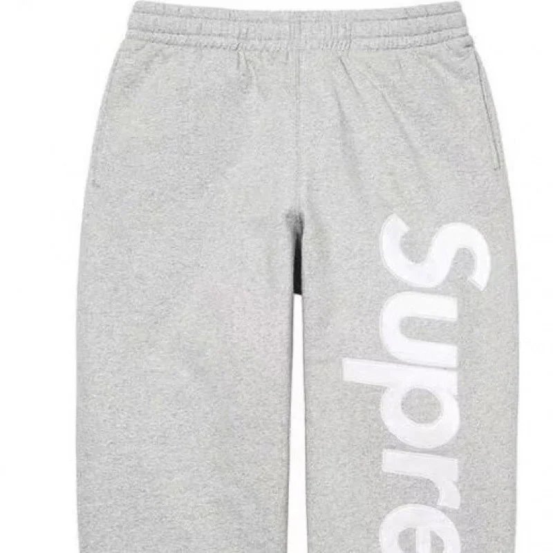 Supreme Gray Logo Jogger Pants, made of soft thick cotton fabric, feature bold 3D brand lettering, elastic waist for comfort, unisex streetwear style perfect for daily casual or urban outfits.