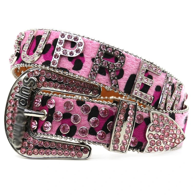 Supreme Pink Leopard Rhinestone Leather Belt with Shiny Metal Buckle, Unisex Streetwear Accessory, Bold Statement Fashion for Trendsetters.