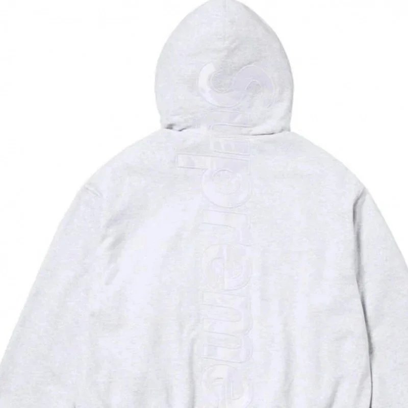 Supreme Grey 3D Embroidered Logo Hoodie, made from premium cotton for softness and warmth. Features vertical back branding, loose fit, drawstring hood, unisex urban style for casual wear.