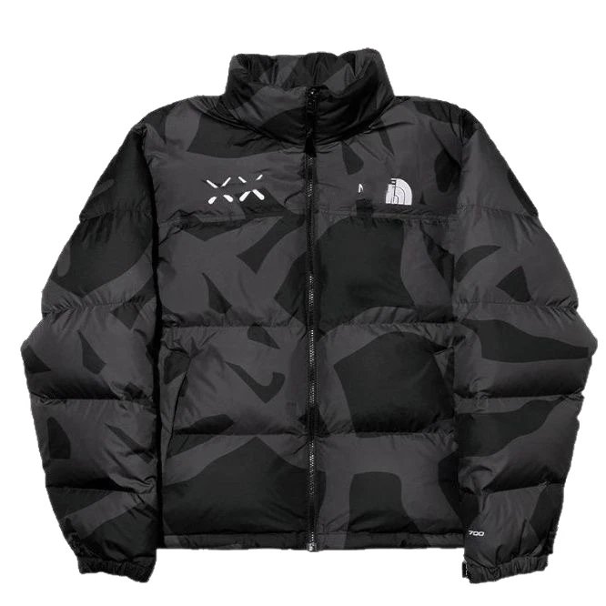 The North Face black-grey camo down jacket, 700 fill power warmth, lightweight windproof fabric, street style, embroidered logo, unisex for winter urban and outdoor adventure.