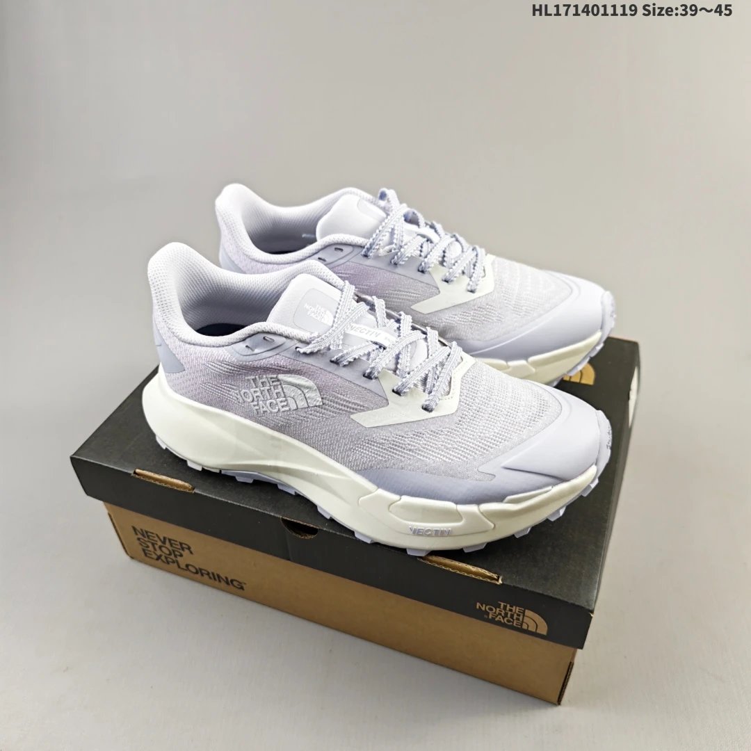 The North Face Light Gray Trail Running Shoes feature breathable mesh and durable rubber soles for cushioning and support. Sleek tech design fits men and women, perfect for city commutes and mountain adventures.