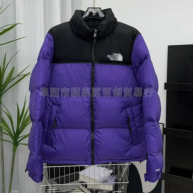 The North Face purple-black down jacket with windproof nylon, warm down fill, stand collar, zip front, unisex, perfect for winter outdoor and urban wear.