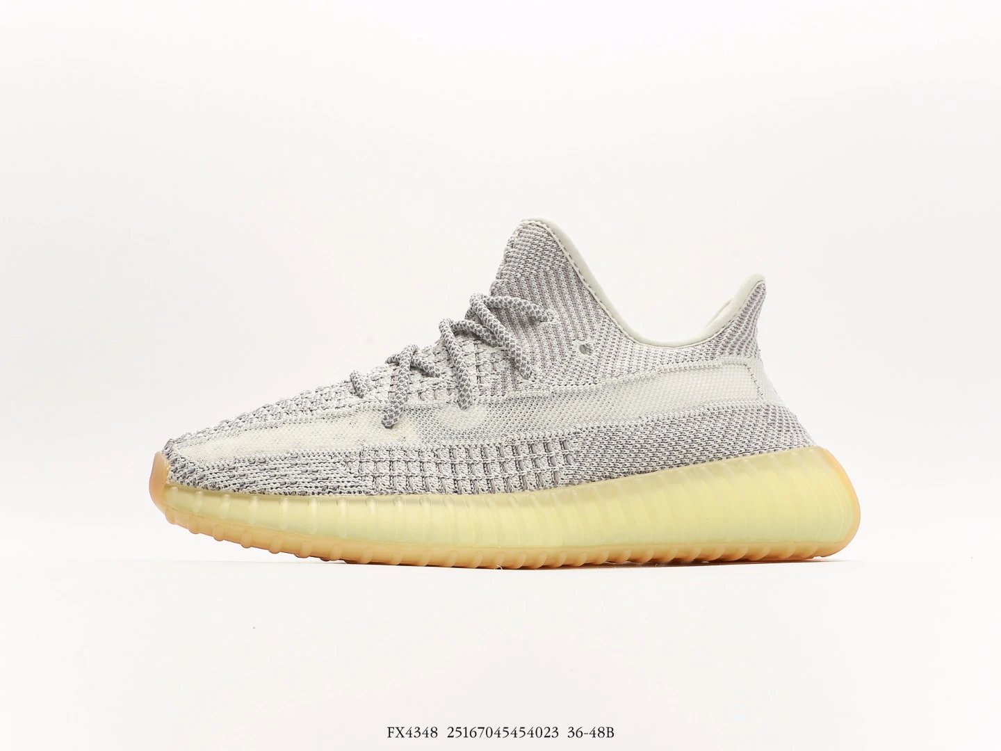Yeezy Grey Knit Sneakers: breathable Primeknit upper with translucent stripe, yellow-tone Boost midsole for superior cushioning, lightweight comfort and unisex avant-garde street style.