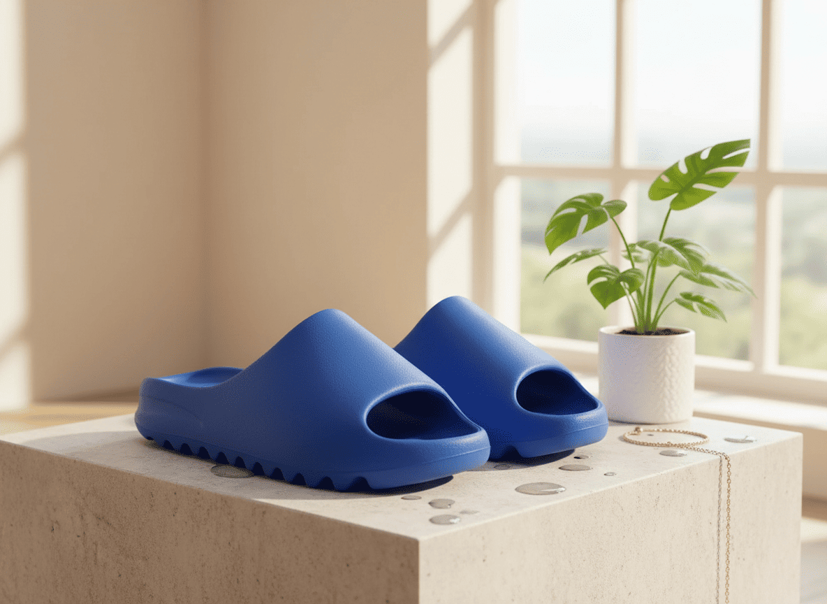 Yeezy Blue EVA Foam Slides feature a minimalist one-piece design, jagged outsole for traction and cushioning, unisex casual style, lightweight comfort, and modern street aesthetic.